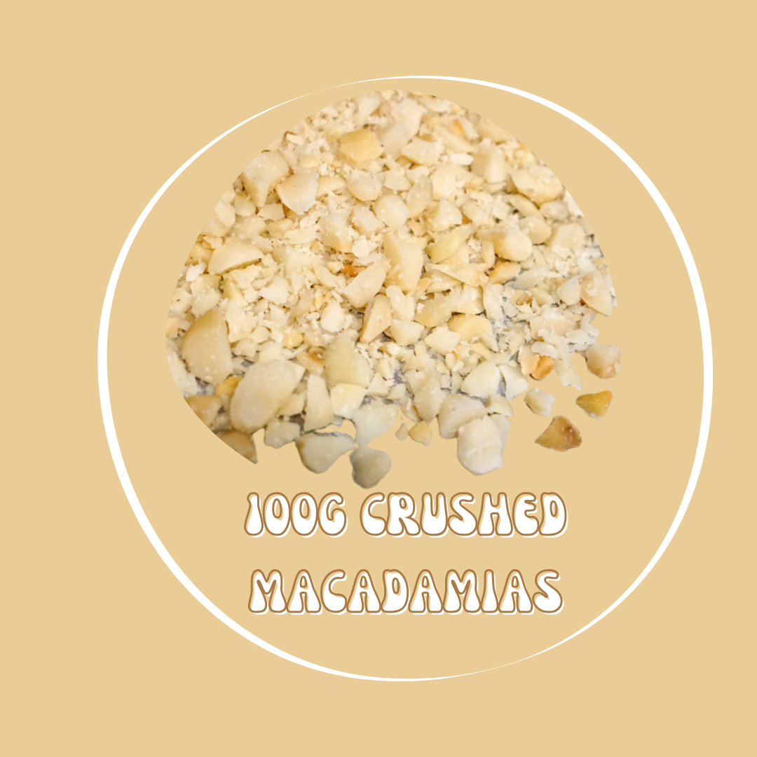 | Organic Crushed Macadamia nuts (100g) to add to any cookie mixes you like. They are creamy, crunchy and perfect accompaniment with the dark chocolate chip and breakfast spice cookie mixes. |